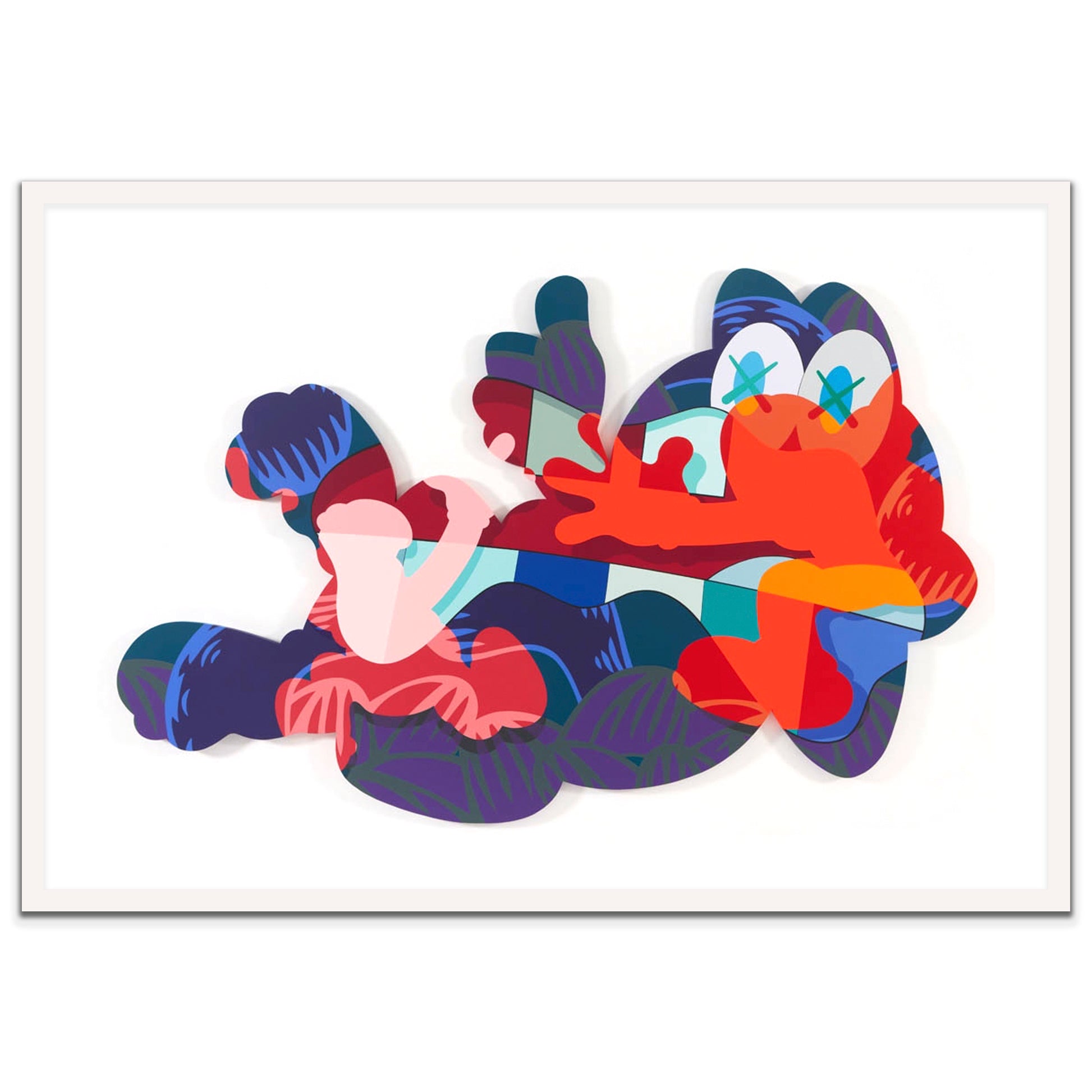 Original poster page from 2016 Kaws edition of SNEEZE, splayed and custom cut wood .