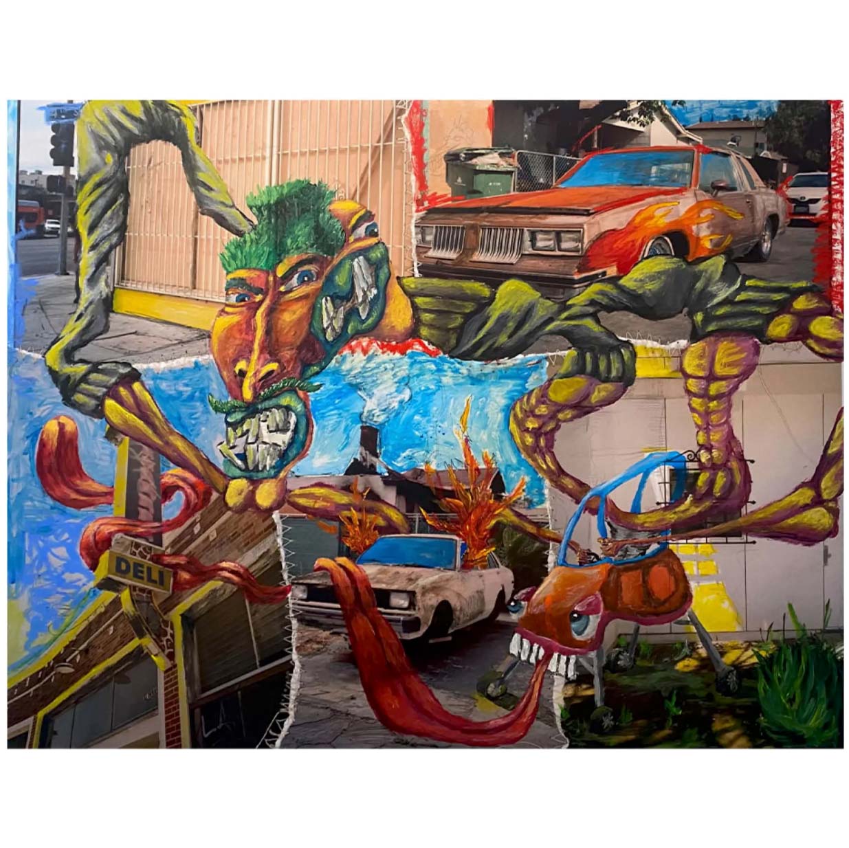 A multiple step piece to accomplish, 'People in LA' started with Joe Ro's shots on film, developed and hand-stitched. The hand-stitched work was then scanned and printed on canvas, allowing Leif Bernhard (Hailing from Norway) to hand paint his signature figures & colors.