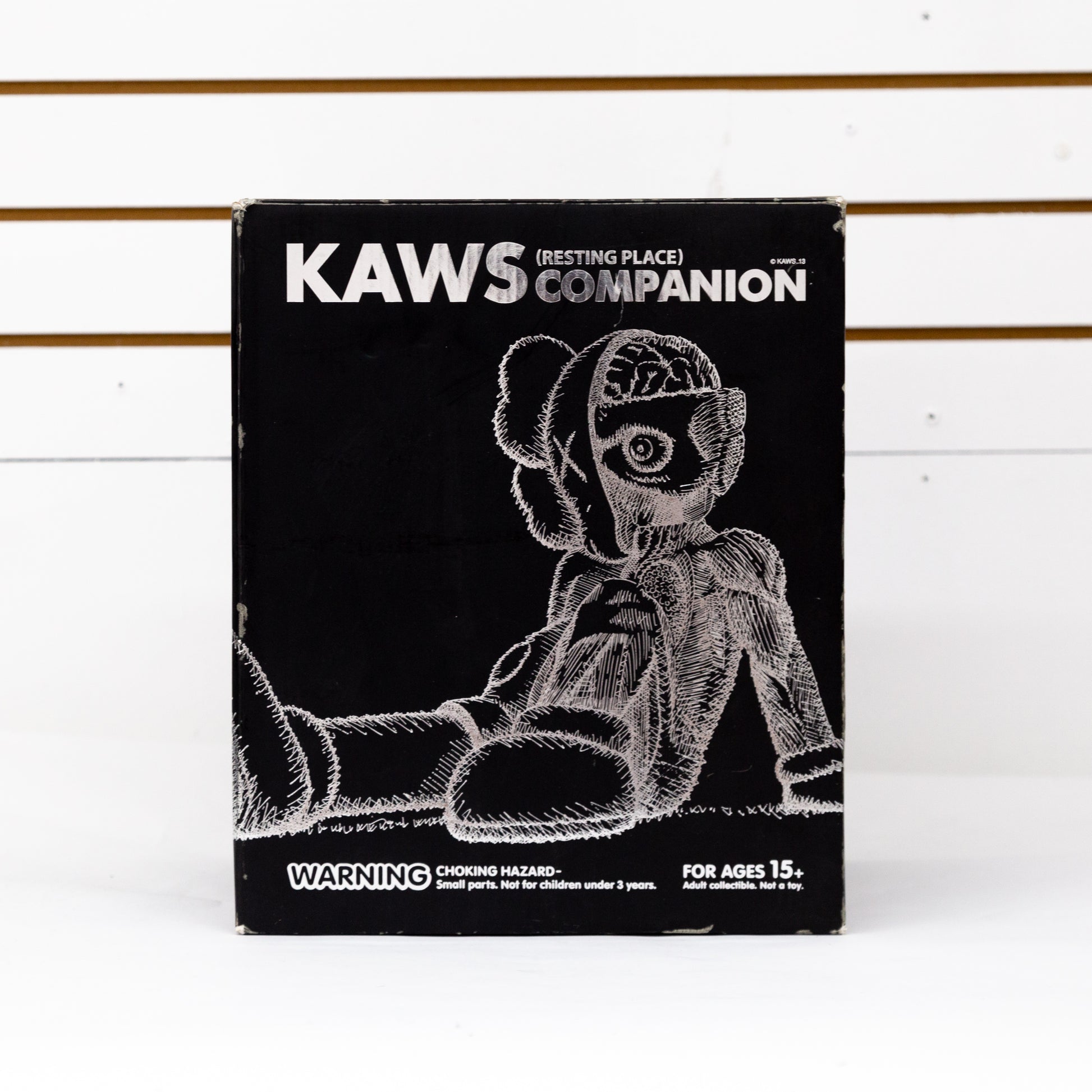 Released in 2013, the nine-inch vinyl toy Resting Place was one of the last sculptures manufactured by OriginalFake, the production company founded by KAWS and Medicom. Marking the end of the seven-year joint venture, the figurine also hints at a transitional time in the artist’s career. With its hands propped on the ground and insides lay bare, Resting Place appears exhausted and exposed. The weary “Companion” can be seen as a symbol for the artist himself, grappling with newfound fame after several high-profile works thrust him into the public eye, including a “Companion” balloon at the 2012 Macy’s Thanksgiving Day Parade and a KAWS-designed Moonman at the 2013 Video Music Awards. Available in grey, black, and brown, Resting Place remains one of KAWS’s rarest “Companion” toys, with just 500 editions produced in each colorway.