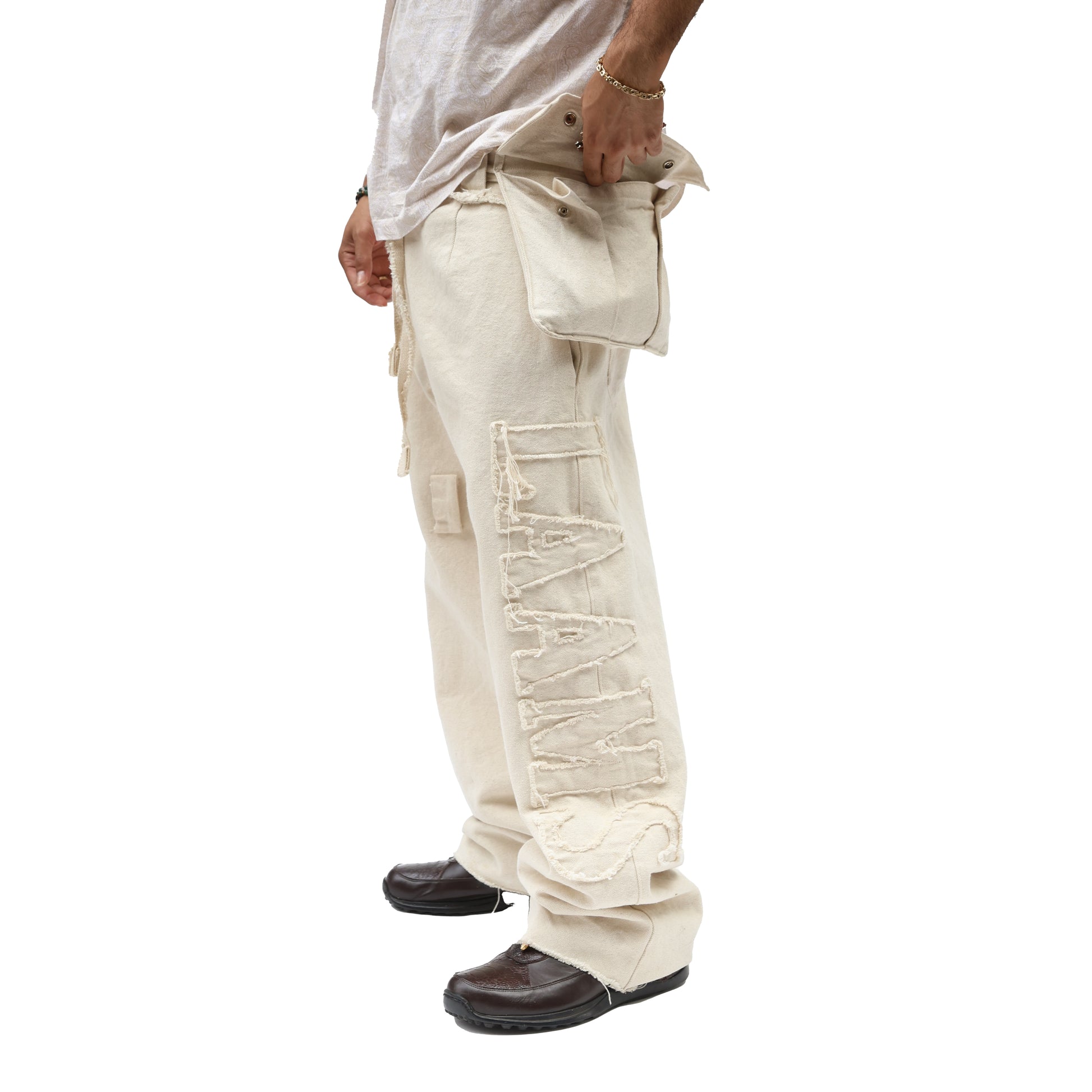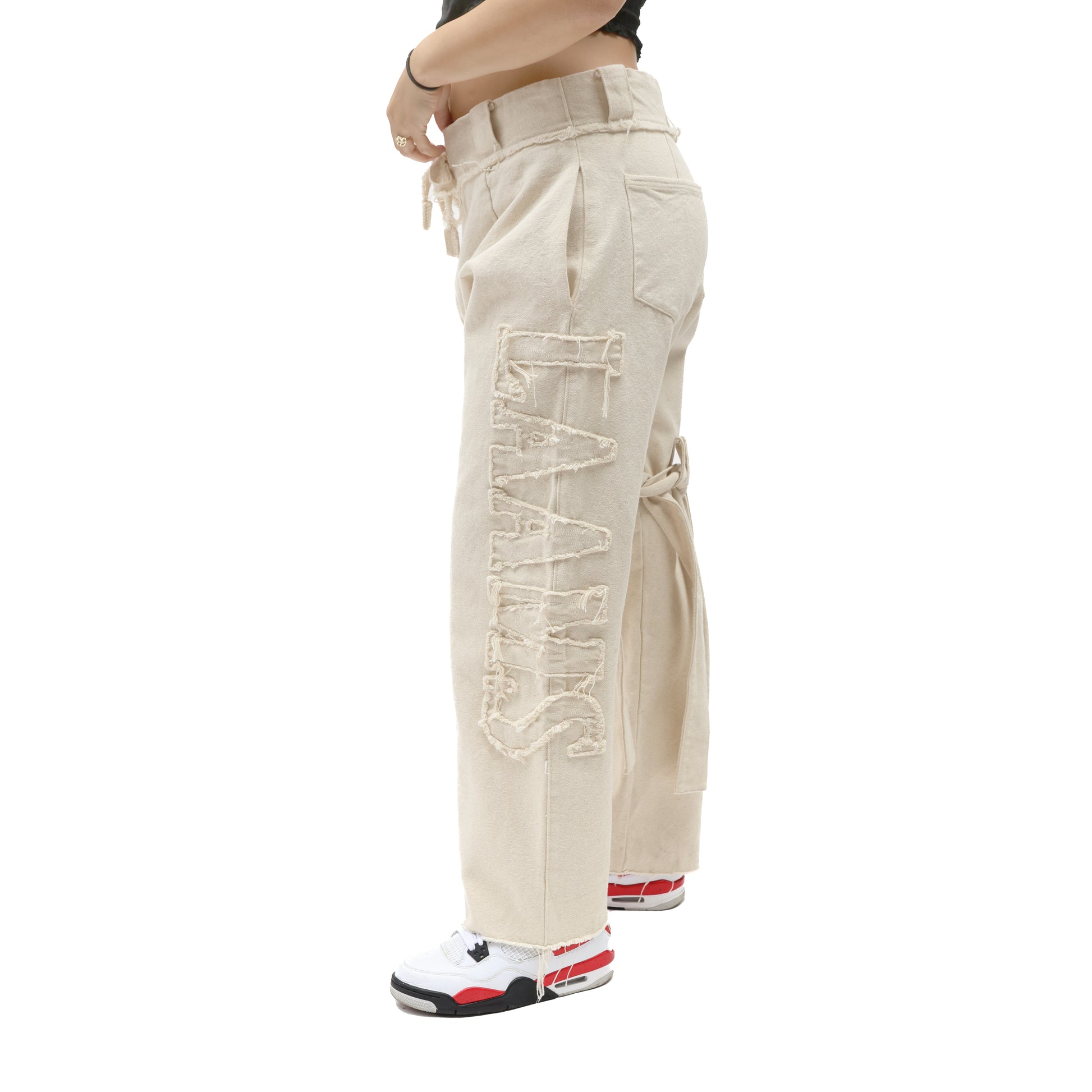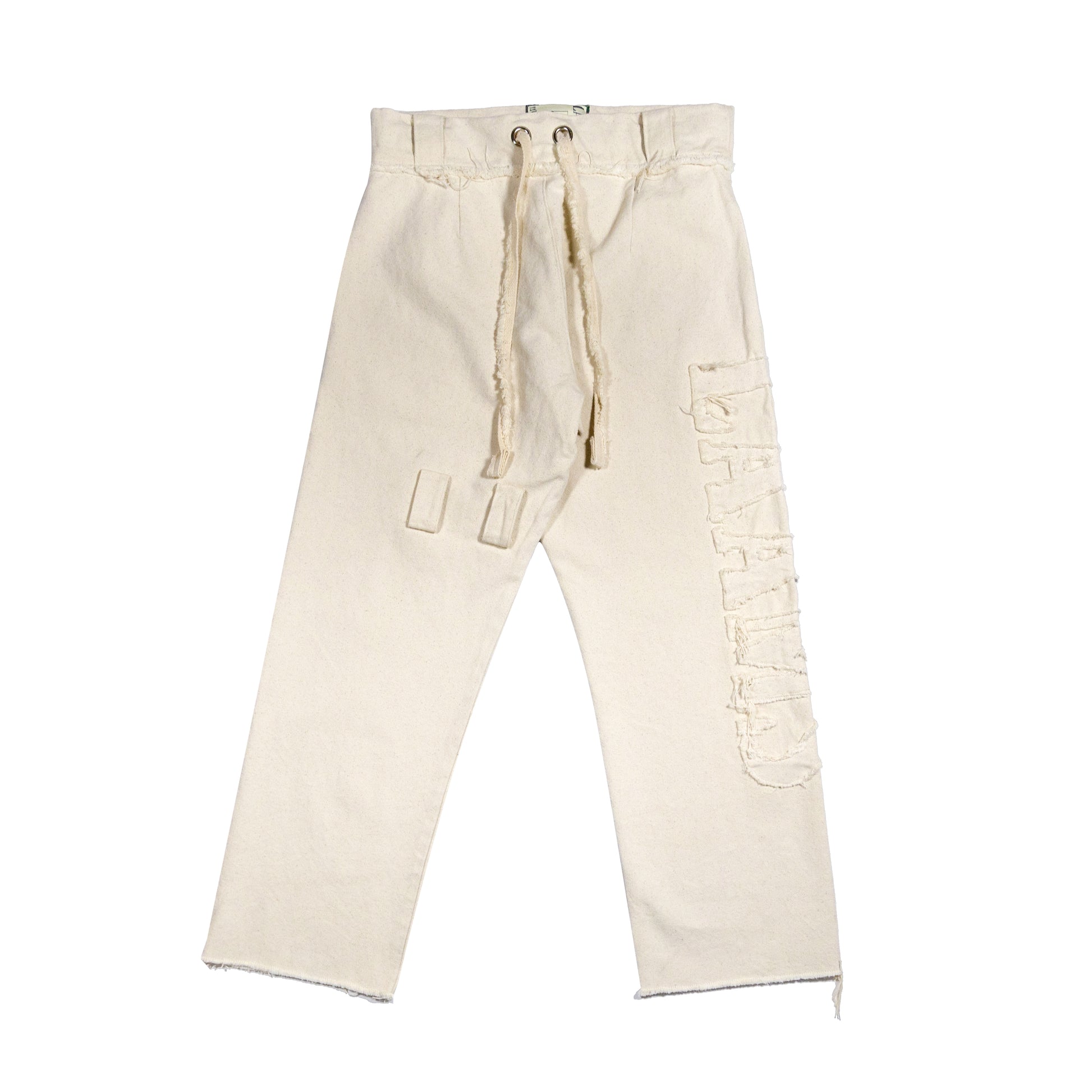 - Frayed Canvas "LAAMS" Appliqué Across Leg