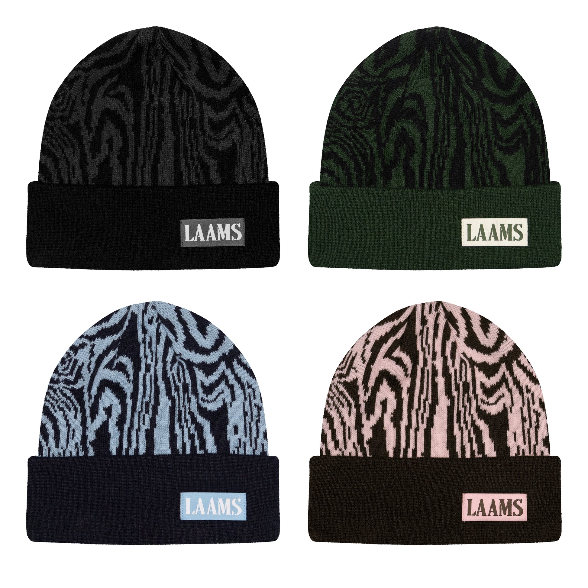 The beanies feature the Woodgrain Print from the "Post Post Bills" Air Force 1 by LAAMS.