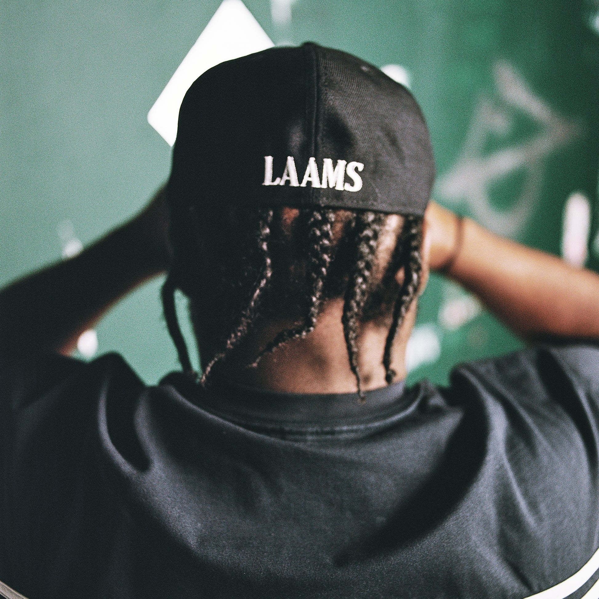 3D Puff LAAMS Emblem Embroidered in White with Metallic Light Blue and Metallic Silver Accents