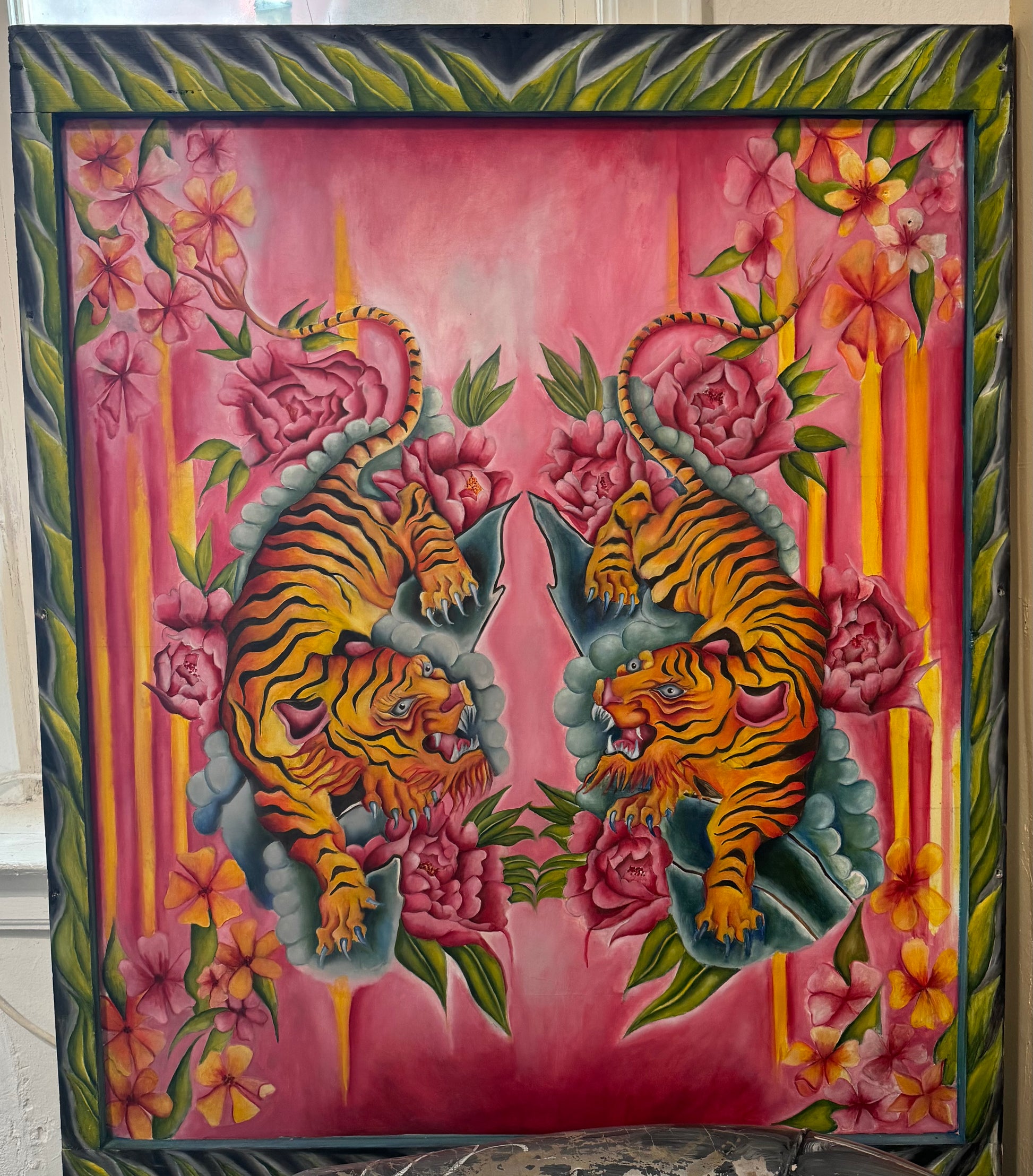 The funnest part of painting for me is grabbing all of my personal inspirations and turning them into my own world. I have realized that I enjoy depicting things that are both masculine and feminine. Trying to create harmony with these two energies. I wanted to make a fun, explosive piece that celebrates both energies. Tigers, being loners and predators often going after what they want. Very indicative of what people consider to be masculine. Yet, the composition has lotus flowers, which represent purity, resilience and rebirth. What people may consider feminine energy. There is a balance in everything, and I believe I constantly try to carry both of these sides of me. I am in my feminine when I express myself, but when it comes to acting out being mission driven my masculine comes out. It is beautiful to know that these two energies are within everybody, one is just as important as the other. It is important to recognize each one, no matter your gender. We all experience this duality.