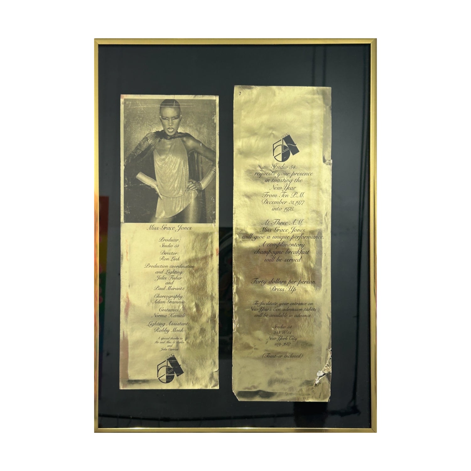 An original VIP invite to Studio 54's inaugural New Years EVE Party 1978-79. Hosted by Grace Jones, Costumes by Norma Kamali - a true piece of New York history.