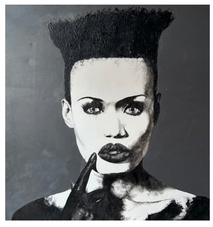 fierce elegance. Working in monochrome, I focused onher iconic hairstyle, bold features, and the raw energy she radiates. The subtle texture and the gesture of her gloved finger reflect her mysterious confidence. pushing spirit.